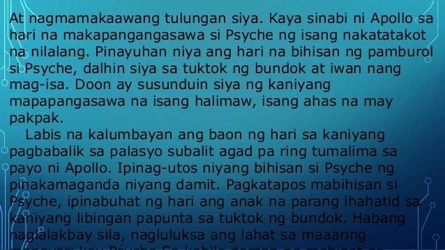 Wakas ng cupid at psyche. 2 question Ano ang simula gitna at wakas sa cupid at psyche. Mahahalagang Pangyayari Ang pag-ibig Cupid at kaluluwa Psyche ay nagkatagpo sa likod ng mapapait na pagsubok sa kanilang pagsasama ay hindi na mabubuwag kailanman. Banghay ng Cupid at Psyche Nagsimula ang kuwentong Cupid At Psyche sa isang mortal na dalaga na ubod ng ganda na ang pangalan ay Psyche.
